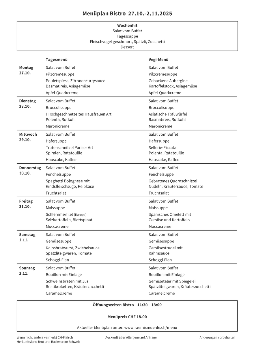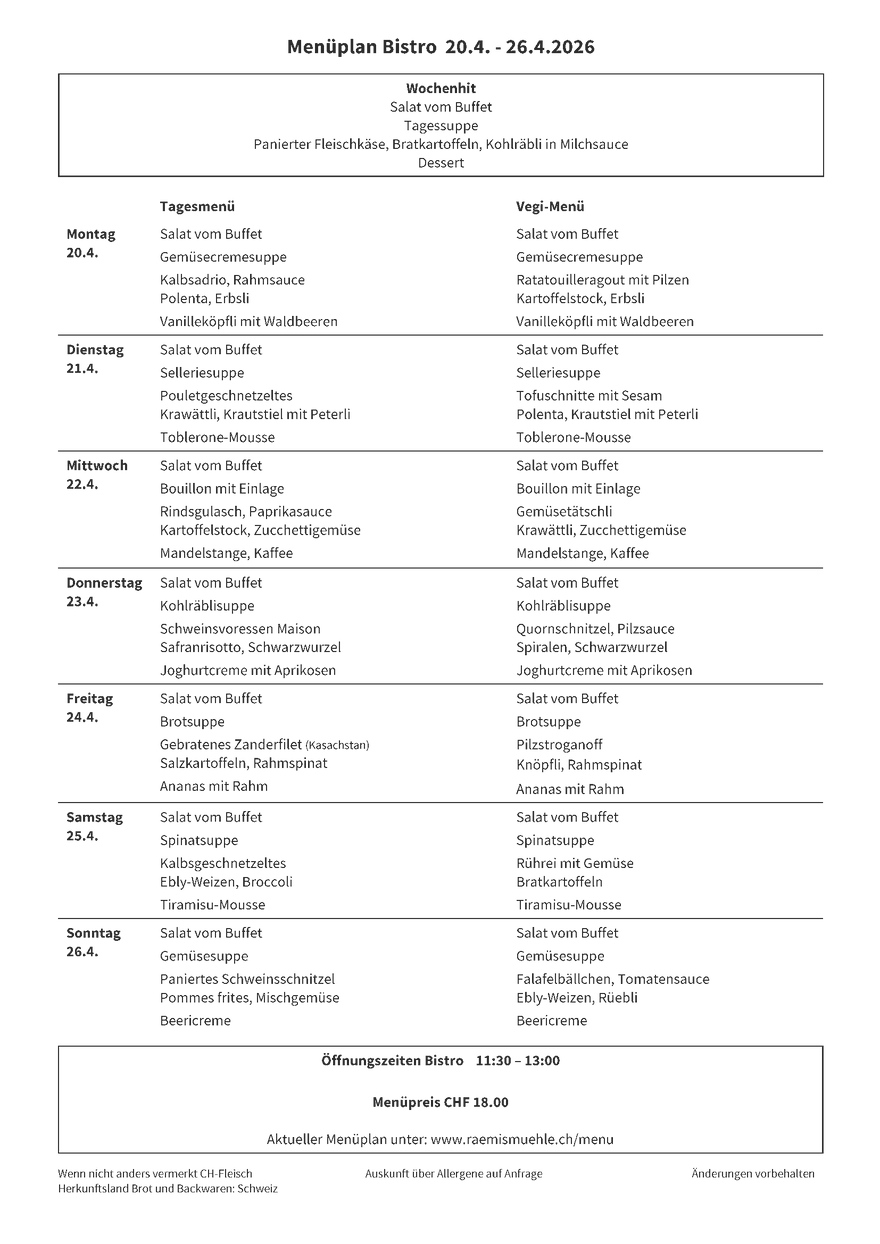 "Wer darf im Bistro essen?" Diese Frage wird uns oft gestellt - und sie ist ganz einfach zu beantworten: "Alle sind herzlich willkommen!" Beim Mittagessen stehen jeweils drei Menüs zur Auswahl. Zum Tagesmenü für CHF 18.00 gehören eine Suppe, ein gemischter Salat, das Menü, sowie ein Dessert. Bezahlen können Sie in bar oder mit Ihrer Kreditkarte.